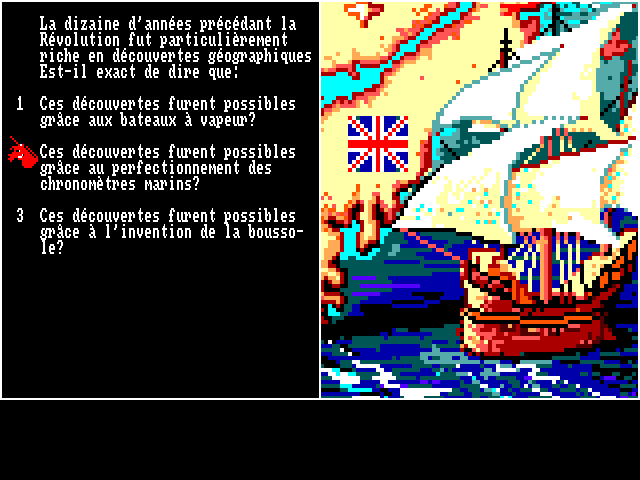 Из начального меню можно выбрать тему для игры, но логичнее будет проходить их строго последовательно; каждая секция включает в себя четыре главы поучительного текста, отображающегося в левой части экрана и сопровождаемого некоторой не особо изысканной, но подходящей по духу иллюстрацией справа. Пролистывать страницы – их на каждую главу несколько – следует при помощи «пробела»; если вы считаете, что уже усвоили учебный материал, – смело жмите на «Esc» и, подтвердив лишний раз своё имя, встречайте экран викторины. Вопросы случайны, и от игры к игре (и от участника к участнику) обычно не повторяются, хотя в любом случае соответствуют прочитанной части темы и требуют некоторого её осмысления: на выбор имеется три варианта ответа, переключаться между которыми можно как стрелкой «вниз» с «вводом» для подтверждения (курсор почему-то имеет совсем не революционную форму единорога), так и цифрами «1», «2» и «3». Предоставляется лишь одна попытка: правильный ответ принесёт в копилку текущего игрока 200 очков и будет сопровождаться знаменитой «Карманьолой», тогда как в случае неверного зазвучит менее известный, но более мрачный «Мститель» («Le Vengeur»; очков, естественно, не дадут).