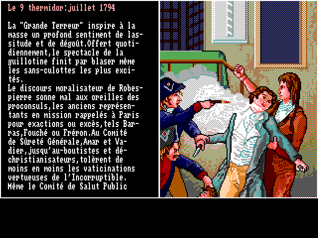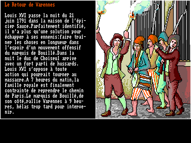 1989 год по понятным причинам ознаменовался всплеском интереса французских разработчиков к тематике отечественной истории. Любители образовательных игр наверняка знакомы с представленным на нашем сайте «инди»-проектом «Paris révolutionnaire»; примерно в том же духе выполнили свою работу и профессионалы из Legend Software (кстати говоря, в создании игры принимали участие будущие знаменитости: художник Дидье Кентен, известный, кроме прочего, по «Little Big Adventure 2», и программист Эрик Сафар, много лет затем трудившийся в легендарной Cryo Interactive, а после её безвременной кончины основавший на руинах Atlantis Interactive Entertainment). Разумеется, у коллектива опытных авторов историческая викторина вышла эффектнее, чем у одинокого школьного учителя; по традициям тех лет «89: La Revolution Française» поступила в продажу сразу для нескольких платформ, причём версия для IBM PC является огромным раритетом, отсутствовавшим в сети в свободном доступе вплоть до появления на нашем сайте в конце зимы 2019 года.