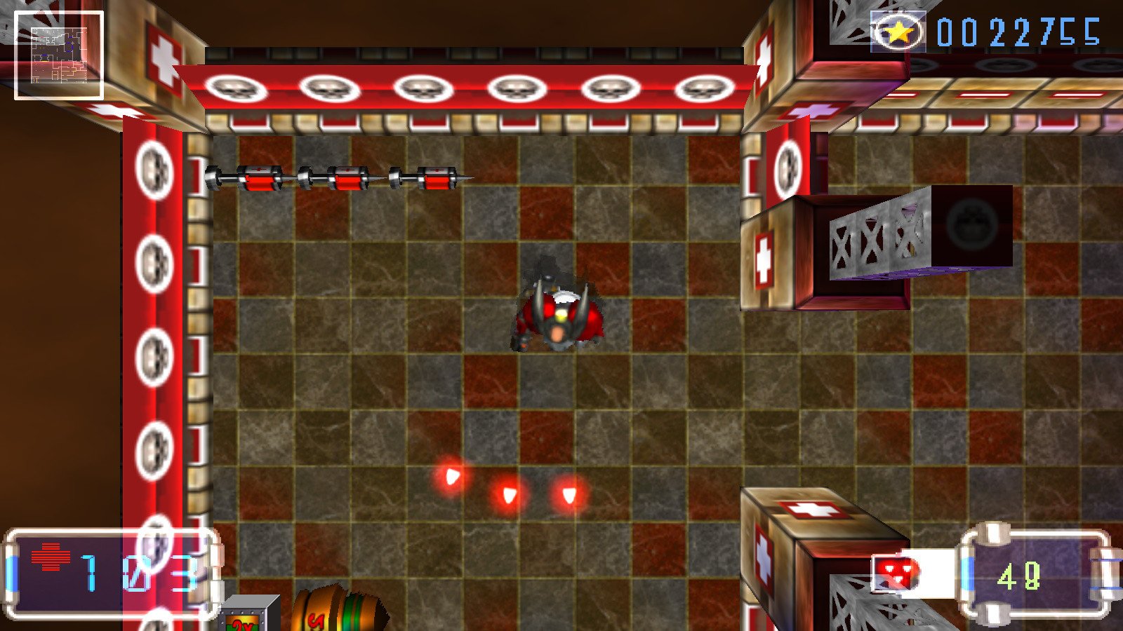 Потайных комнат и прочих секретов нет, хотя на некоторых уровнях подсчитывается процент убитых врагов. В качестве боссов выступают только 4 одинаковых мощных МЕГАДРОИДА на последнем этапе. В моем случае он при первой попытке оказался непроходимым: в центре карты исчез или просто не появился заветный МЕГАКРИСТАЛЛ. Помогла загрузка сохранения в конце 22-го уровня и повторное прохождение.