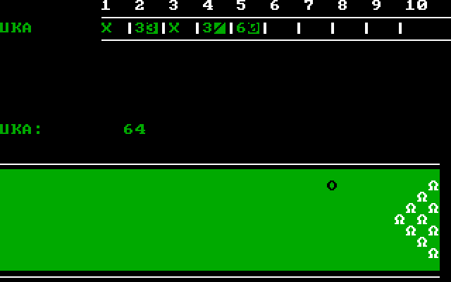 Правда, для большинства проектов более простых жанров, таких как включённые в сборник «Arcade II», не требовалось даже и пояснения правил. В составе насчитывается всего три игры на Microsoft BASIC, выбираемых из главного меню нажатием клавиши с соответствующей цифрой («4» при этом позволяет вывести каталог продукции издателя по состоянию на 3 ноября 1986 года, а «5» – выйти в систему). Первое развлечение официально называется «Bowling», но при ближайшем рассмотрении оказывается не чем иным, как «Bowling Champ» за авторством Joseph Ganci, которая впервые была опубликована в виде BASIC-листинга для платформ VIC-20 и Commodore 64 в конце 1983 года (а затем адаптирована и для других домашних ПК). Как нетрудно догадаться, посвящено оно кегельбану; в начале требуется указать число игроков в пределе от 1 до 4 включительно, привести их имена и выбрать желаемый уровень сложности. Последний показатель колеблется в пределах от 0 («невозможный») до 60 («предельно простой»), но отвечает на самом деле лишь за скорость игрового процесса, которую в современных условиях всё равно придётся регулировать посредством параметра cycles в dosbox.conf (в зависимости от скорости вашего реального ПК рекомендуется выставить его где-то в районе 200-300).