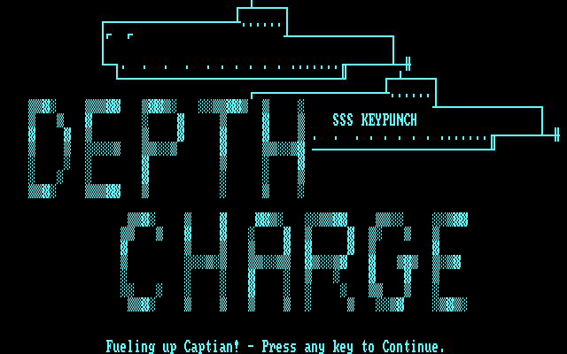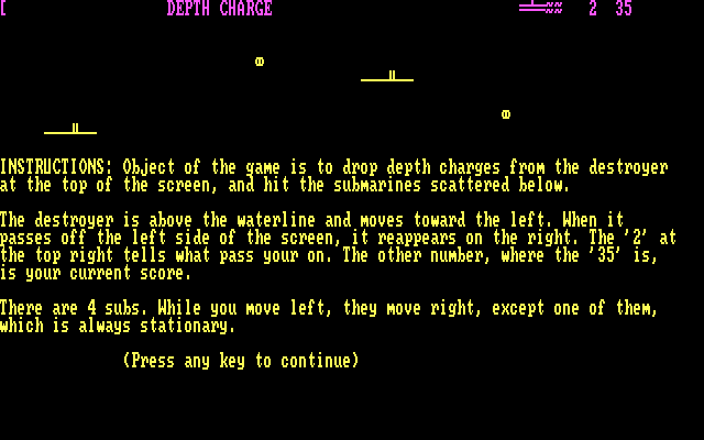 Последняя же составляющая сборника носит название «Depth Charge», - и это тоже одна «бриллиантовая классика» аркадного жанра, появившаяся ещё в 1974 году на больших ЭВМ – и выходившая после этого на множестве других платформ, но как раз на PC практически не известная. Перед нами едва ли не единственное её воплощение для персонального компьютера от IBM, изначально разработанное Джерри Котлером из Лос-Анджелеса в 1982 году в виде простенькой ASCII-программы *.BAS. Вариант от Keypunch, несмотря на перевод в полноценный исполняемый файл, практически не отличается от своего старшего брата, – разве что текст научился местами отображаться различными цветами. Смысл игры заключается в управлении миноносцем: появляясь из правого верхнего края экрана, наше судно автоматически движется прямо над ватерлинией, тогда как всё основное пространство ниже занимают вражеские (подробностей, к счастью, не сообщается) подводные лодки, которые – в количестве не более четырёх за раз – перемещаются, наоборот, слева направо (хотя одна из них при этом постоянно стоит на одном месте). Задача состоит в сбрасывании мин – нажатием клавиши «вниз»; за попадание мы вознаграждаемся очками, которые тем больше, чем глубже располагалась поражённая нами субмарина. Мин всего четыре (то есть в случае если на экране всё ещё видны предыдущие снаряды, медленно опускающиеся на дно, выпустить пятую не получится), как и проходов миноносца по экрану, – номер текущего отображается справа вверху, рядом со счётчиком очков. Последний этап обозначается, кроме того, ещё и квадратной скобкой «[» с левой стороны, – впрочем, если число набранных за четыре попытки очков равно или превышает две сотни, мы получим бонусный уровень (а то и не один).