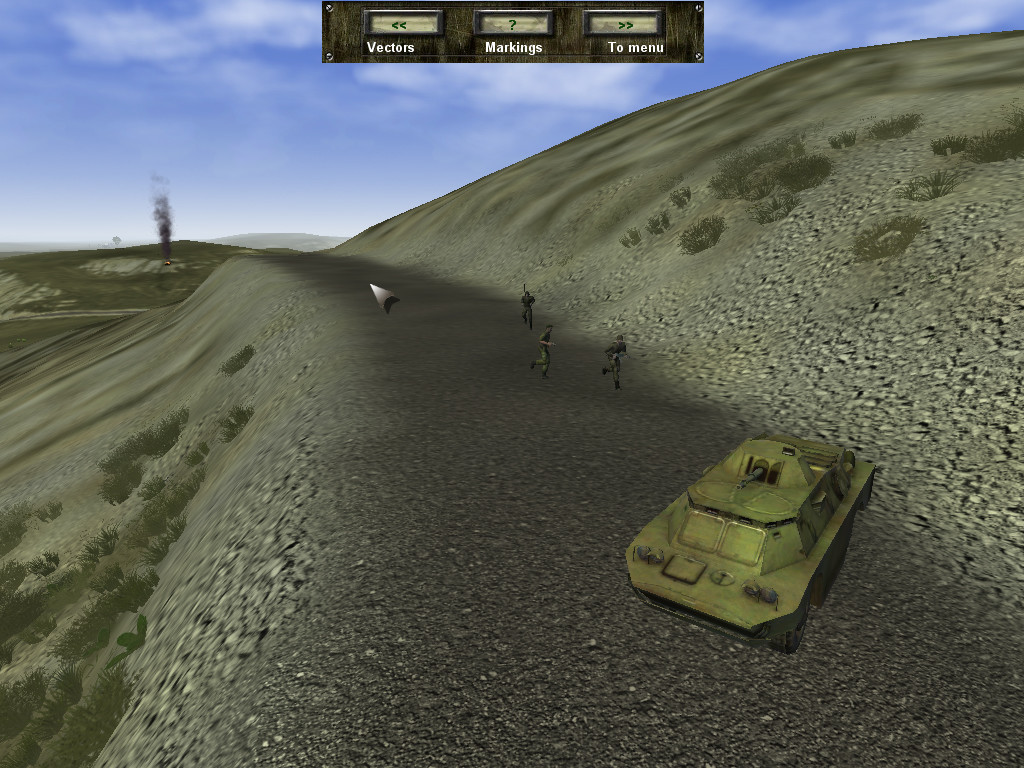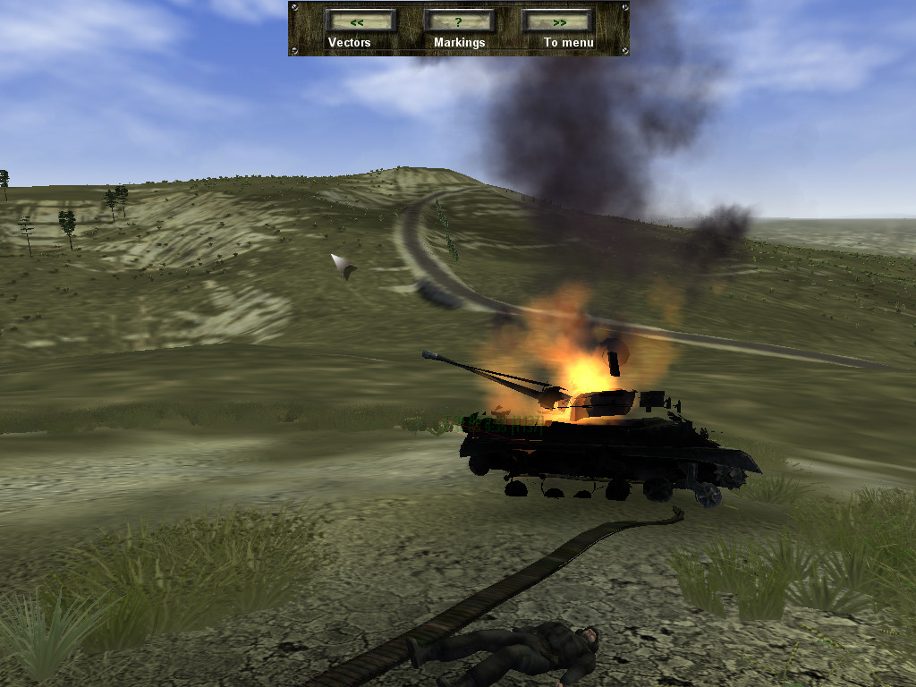 Каждый представленный танк в игре имеет свои особенности как в вождении, так и в бою. Т-34 обладает слабеньким двигателем по сравнению со своими более молодыми собратьями, поэтому не отличается высокой скоростью, да и крутые подъемы не любит – ненароком может заглохнуть в самый неподходящий момент. Его броня уже плохо защищает от современных образцов артиллерии и ПТУРов, а отсутствующий стабилизатор орудия делает невозможной стрельбу с хода. Также вам предстоит освоить премудрость работы с прицелом 85-мм орудия и научиться прикидывать расстояние до цели «на глаз». Боекомплект (кстати, стандартный для всех танков) – фугас, подкалиберный и кумулятивный снаряды. Плюс пара пулеметов. Т-34 в основном будут попадаться в прицеле такие же «старички» как и он сам, - СУ-100 да «Супершерманы»; справиться с этими музейными экспонатами не составит для вас труда. Главное - не проглядеть гранатометчика: вы для них весьма лакомая добыча. Спустя пару миссий вам выдают более современный Т-55. По сравнению с его «предком» за штурвалом 55-го возникает ощущение, будто пересел с «Запорожца» на «Волгу», – отличная динамика, неплохая броня (впрочем, от прилетевшего ПТУРа она не спасет) и наличие лазерного дальномера, сильно облегчающего наведение орудия. Боекомплект тот же, что и у прошлой машины. И наконец, Т-72Б. Быстрый, хорошо защищенный, кроме того – единственный танк, умеющий ставить дымовую завесу и имеющий в боекомплекте управляемую ракету. Но самая уникальная «фича» игры, связанная с 72-м, которую я не встречал больше нигде, - возможность с помощью бульдозерного отвала выкопать окоп и спрятаться в нем.