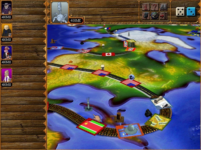 Впрочем, все эти опциональные модификации предназначены для опытных игроков, – новичкам же лучше всего ничего в настройках не трогать и просто проследовать в «Новую игру», выбирая одушевлённых и не очень персонажей (один щелчок левой кнопкой на портрете кого-то из кандидатов в мировые олигархи означает, что за него будет играть человек, тогда как двойной клик вводит в состав партии соперника, управляемого компьютером). Очерёдность действий участников определяется в случайном порядке; для броска кубиков во время своего хода нужно либо нажать пробел, либо щёлкнуть на их изображении в правом верхнем углу. Левее расположено небольшое меню из шести иконок: значок «i» (или нажатие «E» на клавиатуре) вызовет упоминавшуюся уже энциклопедию; «книга», дублируемая клавишей «I», откроет встроенное руководство пользователя; кинокамера (или «F4»), как пояснялось выше, переключит между доступными режимами отображения игрового поля; знак вопроса (и клавиша «Q») позволит пройти также уже знакомый нам тест, но с куда более ощутимыми результатами (вопросов будет только три, причём за правильный ответ мы получим 5 миллионов евро наличными, а за ошибочный будем оштрафованы на ровно ту же сумму); символ двери ожидаемо вернёт в главное меню с возможностью загрузить или сохранить игру (туда же попадают и при помощи «ESC», только будьте внимательны и осторожны: повторное нажатие этой клавиши без спроса выбросит вас в систему!); ну а миниатюра глобуса откроет «Сводную таблицу распределения мировых ресурсов», за обладание которыми мы тут, собственно, и состязаемся.