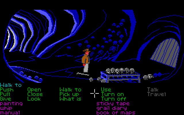 Впрочем, «Индиана Джонс» не простой квест – разработчики добавили в него несколько аркадных элементов. Начнем с того, что нам не всегда придется путешествовать по красочным плоским задникам с видом «сбоку»: иногда придется шастать по темным пещерам и коридорам в перспективе top-down. И если в первом случае перед нами встает задача банального нахождения выхода из хитросплетения подземных выработок, то во втором речь заходит об элементах… stealth. Впрочем, Last Crusade не был бы великолепным квестом, если бы заставлял игрока действовать в каком-то определенном ключе: чтобы объяснить вам, что такое *настоящая* нелинейная (!!!) адвенчура, приведу простой, но показательный пример.