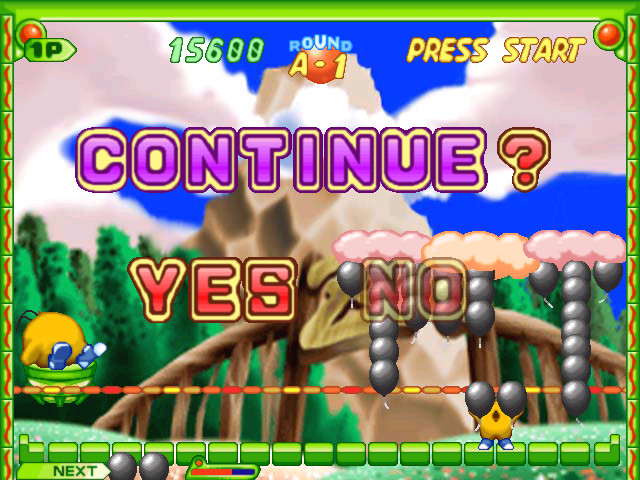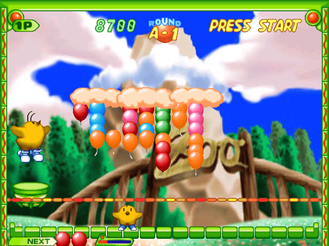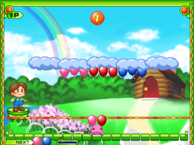 Суть заключается в следующем. В верхней части экрана располагается туча, на которой изначально "висит" некоторое количество "наборов" разноцветных шариков, движущаяся туда-сюда и постепенно опускающаяся; внизу же находится наш протагонист (один из шести героев игр от Taito; что особенно приятно, среди них есть не только люди!), который может перемещаться влево и вправо, а также кидать в вышеозначенную тучу пары шариков и предварительно "вращать" эти "блоки", придавая им одно из четырёх положений. Если в случае попадания три или более шариков одного цвета так или иначе соприкоснулись между собой по горизонтали или вертикали (включая различные "сложные формы" - но исключая диагонали), то они уничтожаются, - однако те, что находились "под ними" (если таковые были), не исчезают и не падают, а поднимаются на "ступень" выше (что, естественно, тоже вполне может привести к новой комбинации). Если на туче уже присутствует вертикальный "ряд" из трёх или более одноцветных шариков, "висящий" на каких-то других, то сам по себе - то есть без добавления вами к нему новых элементов - он уничтожится лишь после того, как соприкоснётся с верхним краем облака. В ряде случаев попадаются "неуничтожимые" прозрачные шарики, поведение которых в случае "освобождения" зависит от их типа. Поскольку наша "цель" подвижная, то есть риск попасть не туда, куда мы хотели, или даже выпустить "снаряд" "в молоко" (тогда он просто улетит в небо). Если туча достигла нижней части экрана - мы проигрываем.
