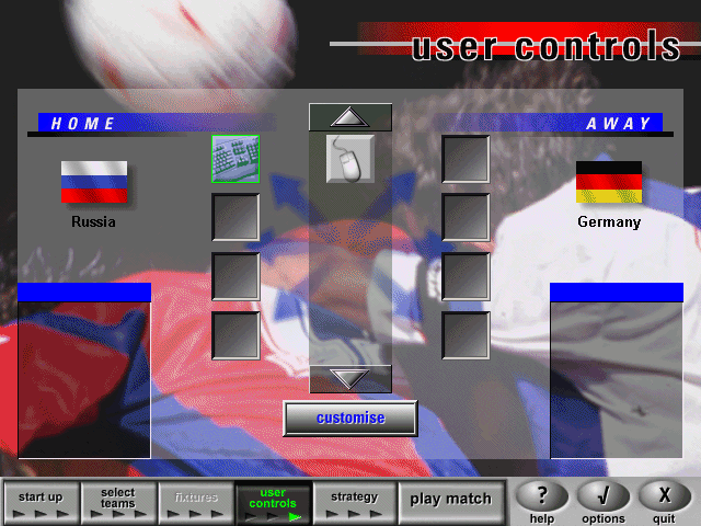 Управление оставляет по себе двоякое впечатление: с одной стороны, подопечные вроде бы очень чётко реагируют на все наши приказы (контролируем мы, естественно, того из них, кто владеет мячом либо находится к нему ближе других) и умеют двигаться в восьми направлениях; с другой - слишком уж малое число доступных ударов (причём "высоких" и "низких", например, среди них нет в принципе), плохо реализованные ведение мяча и механизм отдачи пасов, а также низкий искусственный интеллект (хорошо хоть у всех участников матча - то есть и у соперников тоже) существенно мешают получать удовольствие от процесса. В обороне, кстати говоря, футболисты (тоже все) играют существенно лучше, нежели в нападении, - поэтому как забить, так и пропустить гол не так-то просто. Штрафные, угловые, пенальти, удары от ворот и прочее, естественно, присутствуют; есть возможность выбирать - как перед матчем, так и в процессе его, - тактические схемы (из шести вариантов), а непосредственно по ходу встречи - даже силу будущего удара (около каждого спортсмена будет возникать соответствующая шкала, заполняющаяся в зависимости от длительности удерживания кнопки), - однако реальное влияние всего этого на достижение успеха, судя по всему, невелико. Немного радует лишь участие в подбрасывании монетки с целью определения команды, вводящей мяч в игру, - этот процесс оформлен в виде отдельного "подменю".