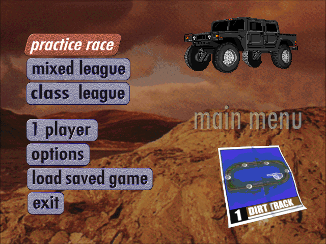 Имеется четыре машины (Hummer, Wrangler, Land Rover и внедорожник от Chevrolet) и три режима: практика (где ездить предлагается в одиночестве), "лига класса" (все участники управляют автомобилями одной и той же "марки" из четырёх вышеперечисленных, пусть и имеющими кое-какие отличия между собой; самих данных "лиг", соответственно, тоже четыре) и "смешанная лига" (где транспортные средства у всех уже разные; разрешается выбирать любое из них). Соперников в двух последних режимах всегда трое (не считая нас, естественно). Следует отметить, что за победу в той или иной "лиге по классу" открывается возможность выбора (в "смешанной лиге") "призового" автомобиля конкретного класса (то есть число доступных машин реально таким способом увеличить с четырёх до восьми). Формально все внедорожники разнятся по значениям трёх характеристик (скорость, ускорение и "управляемость"), но на деле различия между ними не слишком велики (хотя всё-таки имеются и порой ощущаются).