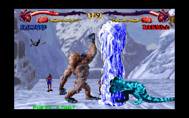 Что ж, настроив игру под свои желания, мы заходим в аркадный режим, выбираем себе бойца и попадаем на одну из арен. Нас встречает её хозяин – наш соперник. В нашем распоряжении – четыре клавиши ударов, четыре клавиши движения, блок вверху при отступлении, внизу при приседании и отступлении. Битва начинается. Люди бегают по всей арене, время от времени начиная неистово молиться своему кумиру. Кровь (если, конечно же, она была включена) льётся рекой. Если нас сильно побили – не беда, съедаем человека, выскочившего на арену (ещё один плюс в копилку кровавости игры), и тем самым восстанавливаем себе здоровье. Финальный удар, один из оппонентов шатается без сил; если это не вы, то проведите комбинацию и добейте его в лучших традициях МК. Вышибание мозга, превращение в корову, испепеление, – каждому персонажу положено по несколько приёмов fatality, способных удовлетворить многих любителей жестокости.