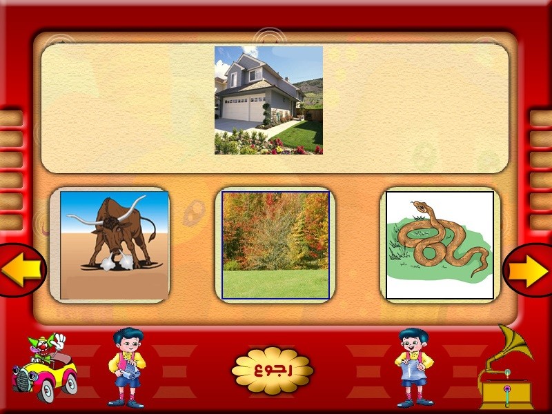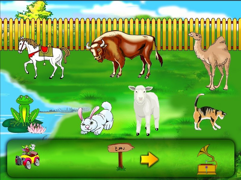 Ну а мячик и качели скрывают в себе самые интересные задания - общим числом три штуки, и все они опять-таки связаны с картинками. Из них какого-никакого знания арабского языка требует только первое: демонстрируется та или иная буква алфавита, а ниже - три изображения; щёлкнуть нужно на тот из объектов, название которого начинается с указанной литеры. Во втором требуется из того же количества картинок выбрать одну лишнюю с точки зрения логики (например, даны бык, волк и дом; решение очевидно), в третьем - сопоставить "по смыслу" одно из трёх изображений с четвёртым, расположенным выше остальных, перетащив на него нужное (например, если сверху показан топор, то выбрать из предложенных вариантов стоит лес, а если волк - то овцу, - ибо дети должны жить в реальном мире!). Для выхода из любого "подрежима" достаточно щёлкнуть на прибитую к столбику дощечку в нижней части экрана, а чтобы покинуть программу совсем - на клоуна-автомобилиста в левом нижнем углу (таковой есть и в "главном меню").