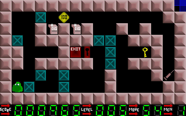 Внимание данная игра привлекает в первую очередь протагонистом, - это аморфное зелёное существо, похожее на кусок слизи с глазами. Его задача на каждом уровне, представляющем собой единственный экран, - за ограниченное количество шагов (отображаемое в нижней части пространства) добраться до выхода, помеченного соответствующим образом (надписью "Exit"), посредством перестановки мешающих движению ящиков, - и одновременно постараться собрать все имеющиеся в данной локации неприятные предметы (шприцы, пакетики с порошком, бочонки с пивом); последнее вроде бы не является строго обязательным, но если этого не делать, то очки, набираемые по итогам прохождения этапа, заработать не получится. На каждом уровне имеется также минимум одна замочная скважина (иногда рядом с выходом, иногда нет), для "ликвидации" которой требуется предварительно взять золотой ключ (если подойти к ней, имея при себе данный предмет, то она именно что исчезнет).
