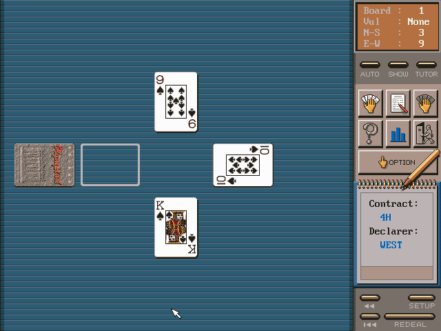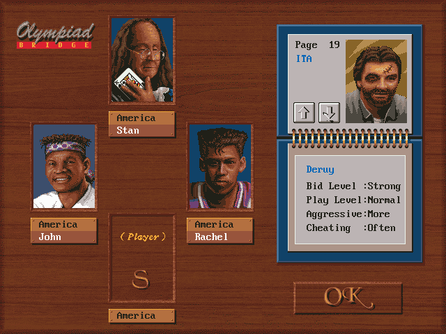 Игра встречает нас главным меню, стилизованным под приёмную клуба National Bridge Club – выдуманной федерации бриджа США. Здесь мы выбираем один из трёх её типов (тренировка и два вида турниров) и переходим к окну знакомства с оппонентами, которых можно настроить: у каждого из них есть портрет и несколько характеристик, определяющих их поведение в некоторых аспектах, например азартность при ставках или агрессивность ходов. Увы, следующий за этим стол и сам процесс ничем особенным не выделяются. А ввиду отсутствия развёрнутой справки, поясняющей правила игры, и обучающего режима желающим познакомиться с бриджем новичкам рекомендуется сперва потренироваться в каком-нибудь специально для того предназначенном проекте.