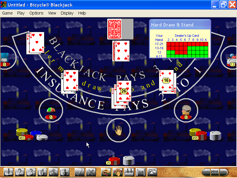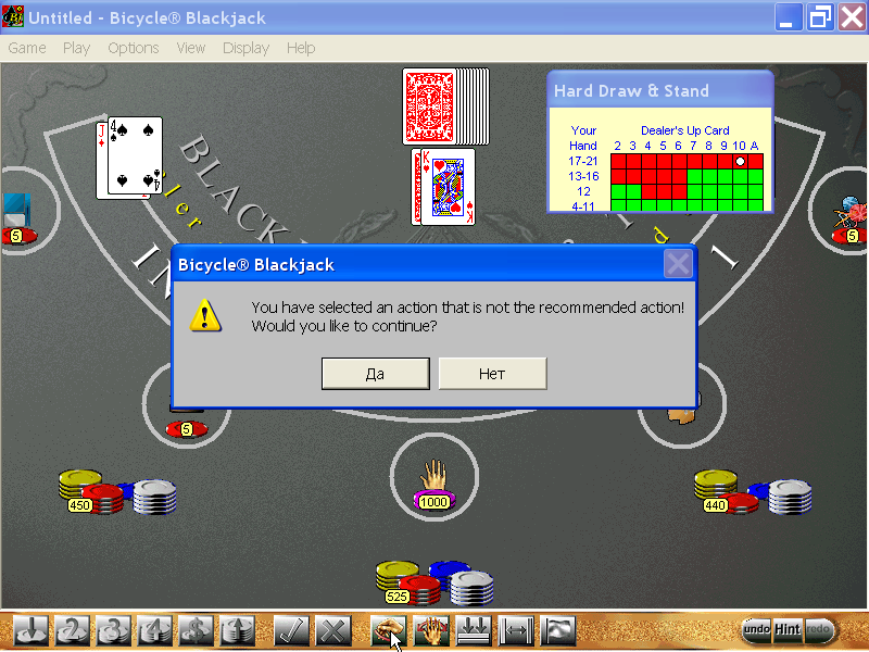 Blackjack посвящена, естественно, блэкджеку. Четыре игрока, трое из которых управляются компьютером, выступают против виртуального крупье, причём все стремятся набрать карты суммарным достоинством, наиболее близким к числу 21 (но не превышающим его). Перед каждым раундом делается ставка, которая по его окончании распределяется между участниками в соответствии с итоговым раскладом. Это, конечно, лишь поверхностное описание правил, - но расписывать их подробнее на этой странице не имеет смысла, так как данная игра как раз и предназначена в том числе для обучения. Поэтому в ней есть встроенный справочник, режим с искусственным ментором, который будет подсказывать дальнейшие действия, свободная игра, где можно проверить, насколько правильно вы усвоили азы, и классическая партия, длящаяся до тех пор, пока реальный игрок не одержит победу или не потратит все выданные на старте деньги.