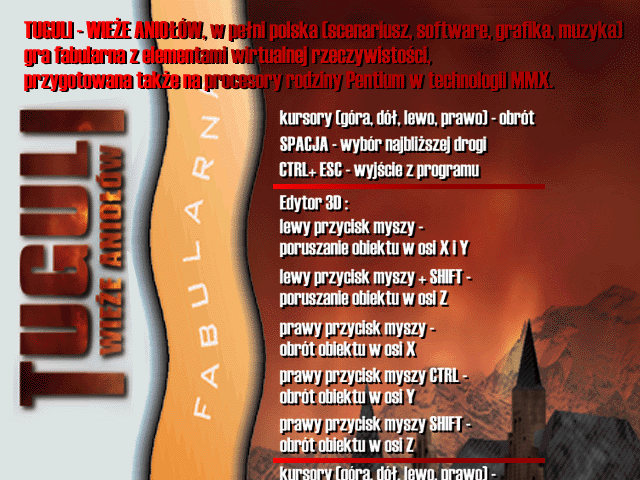 Отменённый проект от солидного польского издателя и разработчика компьютерных игр Optimus Nexus, знакомого нам, прежде всего, по шикарному 3D-шутеру Pył (1998). Приключенческая игра Tuguli: Wieże Aniołów везде анонсировалась как «полностью польская»: сюжет, программирование, графика, музыка. Что же из этого получилось – давайте разбираться…