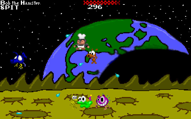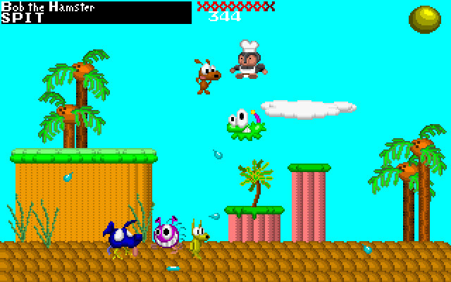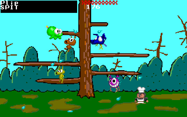 На выбор есть пять одноэкранных арен, различающихся как внешне, так и количеством платформ, и шесть персонажей: хомяк, лягушка, шакал, боузерлиск (именно так), неопределённое существо инопланетного вида и – внезапно – шеф-повар. Все имеют свои характеристики, такие как жизнь, высота прыжка и так далее. Можно выбрать любого, при этом пять остальных будут нашими противниками. Каждый сражается сам за себя, цель - выжить. Тем более что возродиться нельзя: запас хит-поинтов довольно большой, но при гибели участник выбывает из матча. Оружие только одно, и это… плевки. В итоге геймплей прост и банален: перемещаться и прыгать, избегая попаданий по себе, при этом стараясь как можно больше попасть в остальных.
