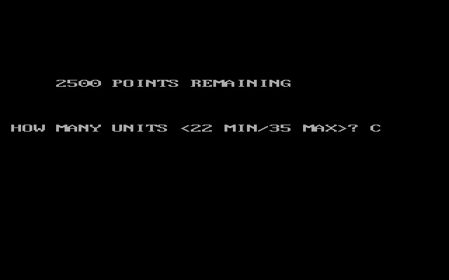 Игра управляется клавиатурой. Перед началом необходимо ответить на два вопроса (про то, цветной ли у нас монитор, и про желание включить звук). Далее последует выбор сложности. Затем начнётся формирование вторгающейся армии на общую сумму в 2500 баллов. Сначала необходимо выбрать количество отрядов: от 22 до 35 (при «цене» одного подразделения в 65 баллов). Затем нужно указать, сколько отрядов будет вооружено «ракетами» (ПТУРы это, или ПЗРК, или и то и другое, – не уточняется), «стоимость» которых составляет 50 баллов. Если общее количество баллов превысит 2500 или в резерве останется больше 300 – выбор придётся повторить. Когда вышеописанные критерии будут выполнены – игрока попросят подтвердить указанные им числа. Только после этого начнётся загрузка.