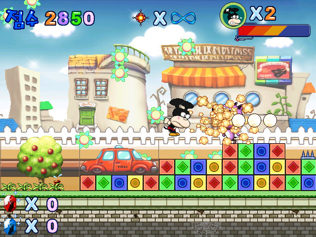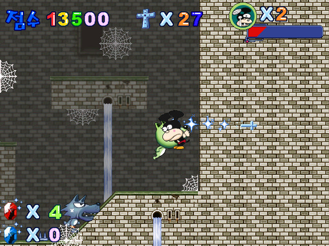 Есть в данном платформере и некоторое количество "изюминок". Так, некоторые этапы третьего уровня представляют собой, по сути, непрерывный полёт в условную "пропасть" (имеющую дно, падение на которое безопасно), в процессе чего нужно избегать столкновений с минами и при желании собирать бонусы, - а, например, шестой эпизод включает в себя как очень небольшой опасный участок, где сверху падают острые камни, способные причинить нам вред, так и "головоломку" (в кавычках, конечно, ибо "решается" она методом банального "перебора"), связанную с теми самыми порталами (их ближе к концу уровня очень много, и требуется вычислить взаимосвязь между ними). Но самое необычное ожидает нас между уровнями: здесь игроку предлагается поучаствовать в викторине на знание мира Ганъгадина - то есть комикса-первоисточника (!). На экране показывается фигурка героя, стоящая на платформе, висящей над водой, - и последовательно задаётся три вопроса с четырьмя вариантами ответа на каждый (все тексты, естественно, на корейском языке). Если ответить правильно - то можно заработать дополнительные очки; в случае ошибки же демонстрируется анимация падения персонажа в воду, однако переход к следующему эпизоду осуществляется в любом случае (и если мы "срезались" на втором или третьем вопросе, то ранее заработанные баллы сохраняются).