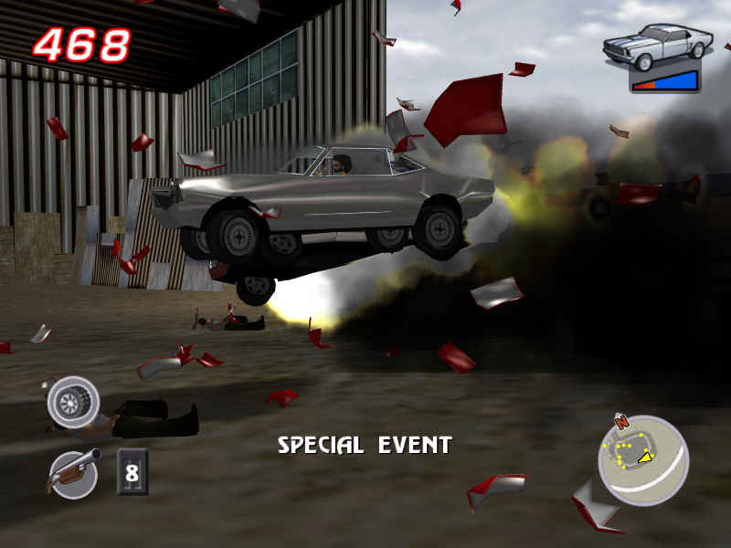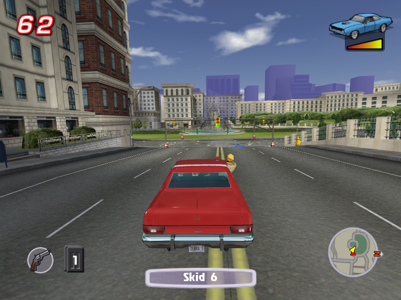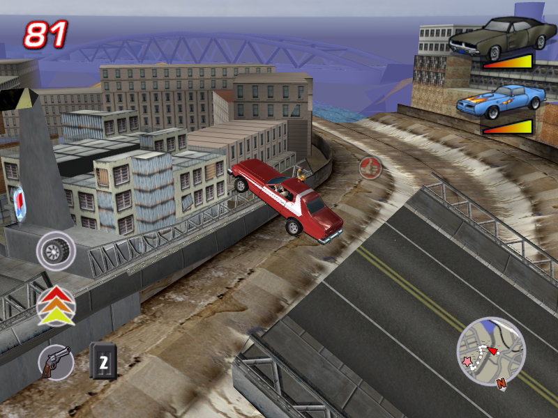 Данную вещь совершенно неправильно сравнивать ни с GTA 3 (что иногда почему-то пытаются делать), ни вообще с какой-либо более "традиционной" гонкой - даже именно аркадной со стрельбой. Да, здесь есть "свободный" режим (делать в котором, правда, особо нечего, ибо Бей-Сити - город довольно однообразный), а равно разрешается (и даже иногда приветствуется) совершение во время миссий всевозможных "противоправных" действий вроде расстреливания плафонов фонарных столбов или, скажем, сноса колёсами каких-нибудь объектов окружающей обстановки (например, мусорных баков), - но вот убить здесь даже в принципе реально лишь бандитов (причём и это демонстрируется без детализированного насилия), тогда как наехать на пешеходов не выйдет при всём желании (но нормальному человеку такого, понятно, и не захочется), а уж застрелить их - тем более (прицел при наведении на них просто не станет "активным"). На самом же деле игра совсем "про другое".