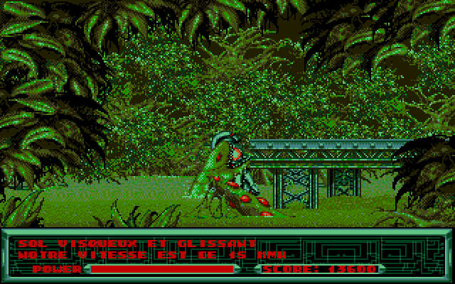 Но гениальность Silmarils мы понимаем, когда обращаем внимание на графическое оформление (а его не заметить невозможно). Первый раз, когда я увидел Metal Mutant, я долго всматривался в монитор. Я был поражен тем, что можно было создать, используя 256 цветов. Графическое оформление игры безупречно. Каждый игровой экран можно воспринимать как произведение искусства, можно любоваться им, как картиной. Можно долго всматриваться и находить новые детали, которые ты ранее не замечал. Анимация тоже выше всяких похвал. Дизайнеры поработали на славу: картина индустриального декаданса в начале игры сменяется технологической утопией, поражая своей масштабностью. Контраст индустриальной свалки, отданной на волю природе, которая залечивает свои раны, поглощая металлические конструкции в пучине болота, обвивая их лианами и закрывая их листьями, и индустриального рая, высокотехнологичного, безупречного, аккуратного.