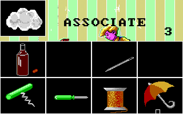 «Associe» входит в группу из трёх игр, появившихся на нескольких платформах и на пяти языках: какой-нибудь из этих последних требуется выбрать сразу после запуска нажатием одной из функциональных клавиш, после чего на экране появится подробная инструкция для родителей. К счастью, ребёнок, скорее всего, прекрасно поймёт, что именно ему здесь нужно делать, и без долгих объяснений со стороны старших. Папе, маме или воспитателю понадобится ещё только выбрать продолжительность игры – от четырёх до тридцати шести уровней. Смысл происходящего на таковых вполне ясен: перед нами на экране отображается два ряда по четыре чёрных клетки, в нижнем из которых расположены различные бытовые предметы (катушка ниток, молоток, варежки, зонтик, зайчик и т. д.) Слева вверху в подобной же чёрной ячейке будут появляться один за другим изображения ещё четырёх предметов, причём каждый из них составляет своего рода «пару» одному из уже имеющихся. Соответственно, следует навести курсор на подходящую картинку нижнего ряда – и нажать левую кнопку мыши, «пробел» или «ввод». Если наш логический вывод окажется правильным, верхний предмет переместится во второй ряд прямо над своей «парой», – в противном же случае он останется на исходном месте, а счётчик ошибок в правом верхнем углу увеличится на единичку. Получается, что с последней из четырёх загадок на каждом экране всё оказывается совсем уже просто; после её решения произойдёт переход к следующему этапу из числа заданных при начале игры, а по исчерпании таковых нам зададут вопрос на предмет желательности повторного упражнения.