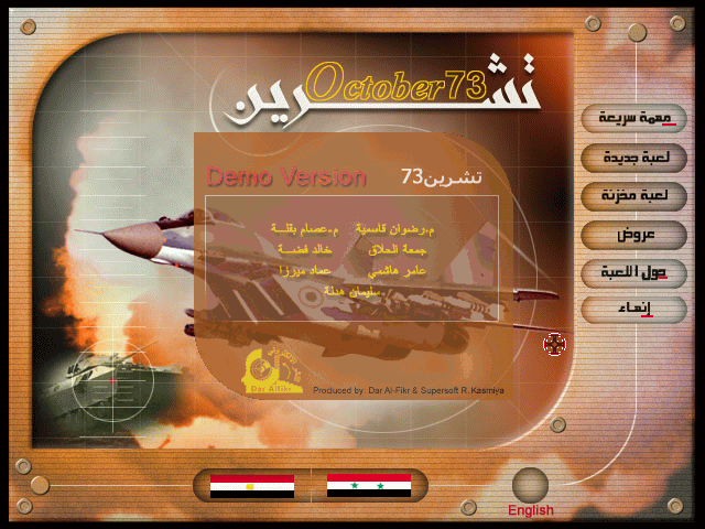 October 73, известная также как War 73, - это самая первая арабская компьютерная игра как минимум для IBM PC, а возможно - что и вообще. Создал её в 1999 году сириец Радван Касмия - на тот момент юный энтузиаст программирования, а спустя буквально несколько лет - директор основанной им компании Afkar Media и фактически ключевая фигура во всём зарождавшемся тогда национальном игростроении. Поскольку в те времена, как многие наверняка помнят, Интернет не имел по-настоящему широкого распространения даже на Западе, не говоря уже о "третьем мире", то распространялась данная вещь посредством "флоппинета" в дружеских кругах (разумеется, бесплатно), но в скором времени обрела на родине и в других арабских государствах популярность и известность. На Западе о ней узнали предположительно в 2012 году - из замечательной книги "Video Games Around The World", впоследствии переизданной, а затем и из переведённого на английский язык интервью автора, где он, в частности, сообщил, что при создании своей первой работы вдохновлялся знаменитой леталкой River Raid. Но источники источниками, а вот самой игры долгое время не было нигде, - даже в арабоязычном Интернете никаких её следов обнаружить не удавалось. В конце концов коллектив нашего сайта, занимавшийся её розысками с 2018 года, обратился к самому Радвану, - и в результате позитивного общения появилась вот эта страничка.