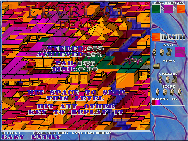 Иссякающий с каждым шагом запас энергии - ещё один аспект, усложняющий прохождение. Его стартовое значение зависит от выбранного уровня сложности (который влияет не только на этот параметр), и если на самом лёгком по этому поводу можно не беспокоиться, то уже на среднем стоит принимать в расчёт, особенно после прохождения первых трёх этапов. Если вдруг показатель обнулится, то это будет равнозначно любому другому способу гибели - у нас отнимут одну из трёх выдаваемых в начале попыток и отправят проходить уровень заново. Если же все “жизни” иссякнут, то придётся начинать всё сначала, предварительно вписав своё славное имя в таблицу рекордов (если, конечно, набралось нужное количество очков).
