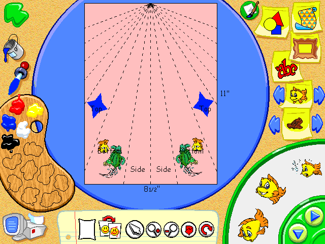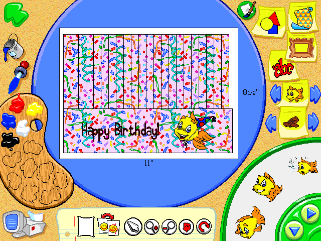 Данное творение было выпущено в 2000 году, когда успели прогреметь первые четыре игры о рыбке Фредди и её друге Лютере, а также две незамысловатых аркады в той же вселенной, кои можно отыскать на нашем сайте. Следующая номерная часть, что окажется последней, выйдет только через месяцы и месяцы. Так что же представляет собой Freddi Fish's One-Stop Fun Shop? Примерно то, что и указано в названии, - мастерскую. В главном меню мы можем выбрать из шести категорий вещи для изготовления и последующей распечатки: украшения для вечеринок; дверные таблички, закладки и списки; открытки и знаки; большие иллюстрации персонажей и генерируемые на основе наших предпочтений раскраски; детские игрушки (бумажные самолётики, браслеты, обручи на голову); календари, открытки, конверты (да-да, часть изготовляемых вещей повторяется несколько раз в различных категориях).