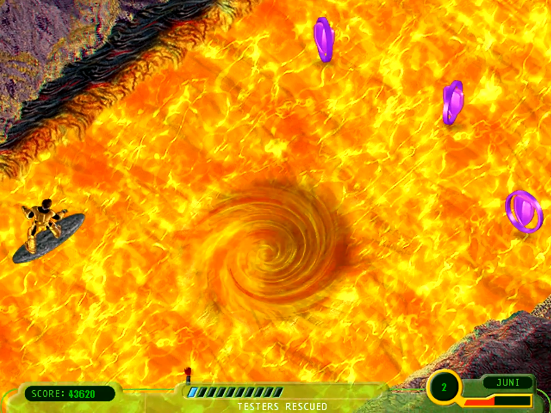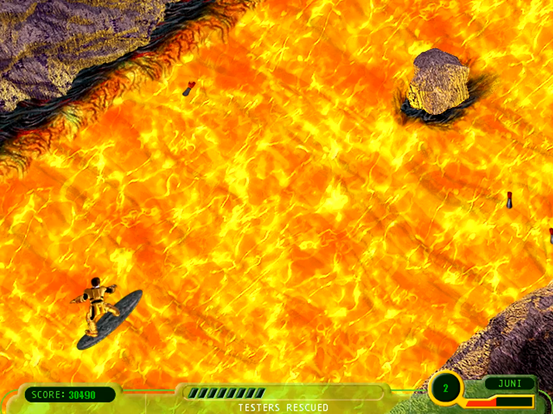 Этап сёрфинга по лаве также не представляет собой ничего необычного. Хотя как сказать… В лаве утопают тестеры (которых что-то слишком много), и их нам нужно спасать, вытягивая за руку, попутно уклоняясь от булыжников и водоворотов. Иногда попадаются бонусы, чуть облегчающие процесс. Спасли нужное количество? Хорошо, переходим на следующий этап. Повторяем трижды. Ну вы поняли.
