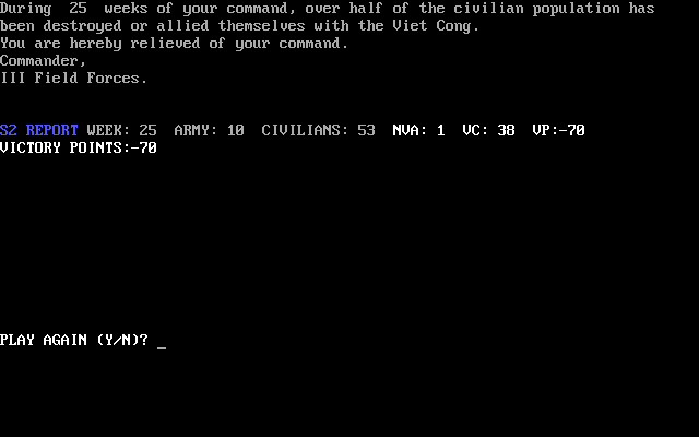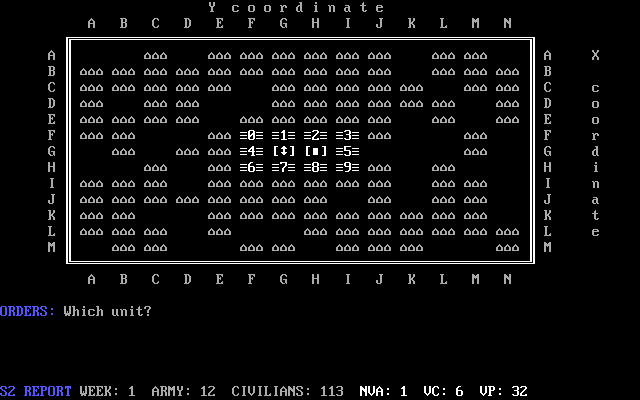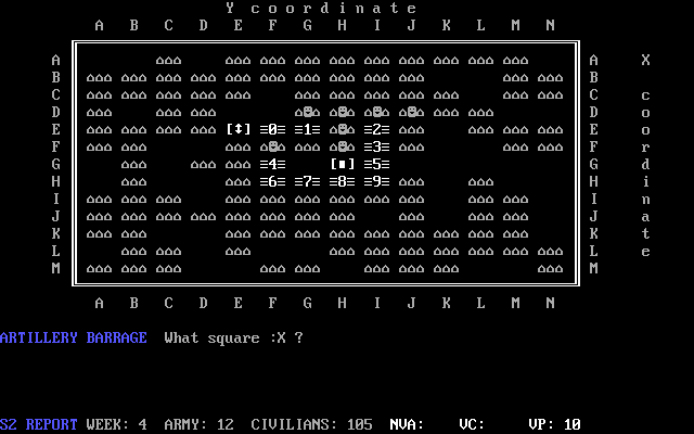 В каждый ход мы вольны подвинуть одно из южновьетнамских подразделений: ввести его номер и обозначить направление перемещения. После выполнения этого действия часть находящихся по соседству мирных жителей станет лояльной нам, а это значит, что противник (изначально невидимый - его ещё предстоит обнаружить) не сможет так просто подойти к этим людям и переманить их на свою сторону, что очень важно - ведь сохранение приверженности "демократическим идеалам" и выживаемости населения являются ключевыми факторами одержания победы. Перебить неприятелей и примкнувших к ним необходимо до того, как останется менее половины жителей.