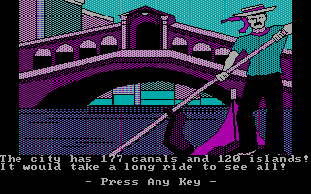 Разумеется, это нисколько не отрицает и собственных достоинств «Adventures in...». Проект этот предназначался для Apple II, бывшего на то время де-факто стандартом в системе образования, да и одним из наиболее популярных домашних компьютеров, – однако все три части были чуть позднее изданы и для IBM PC/PCjr, а «североамериканский» выпуск портирован ещё и на Commodore 64. Сразу заметим, что по внешнему своему виду «шпионские» географические приключения соответствуют стандартам начала-середины восьмидесятых, но никак не 1987 года, когда и поступили в продажу их инкарнации для DOS: из графики поддерживается один только CGA-адаптер, да и то в наименее привлекательном серо-буром варианте палитры; даже на PCjr цвета выглядят лишь чуточку ярче (ну хотя бы белый тут именно что белый, а не грязно-сероватый), – звуковые же эффекты, как и музыкальное оформление, вообще отсутствуют как класс.