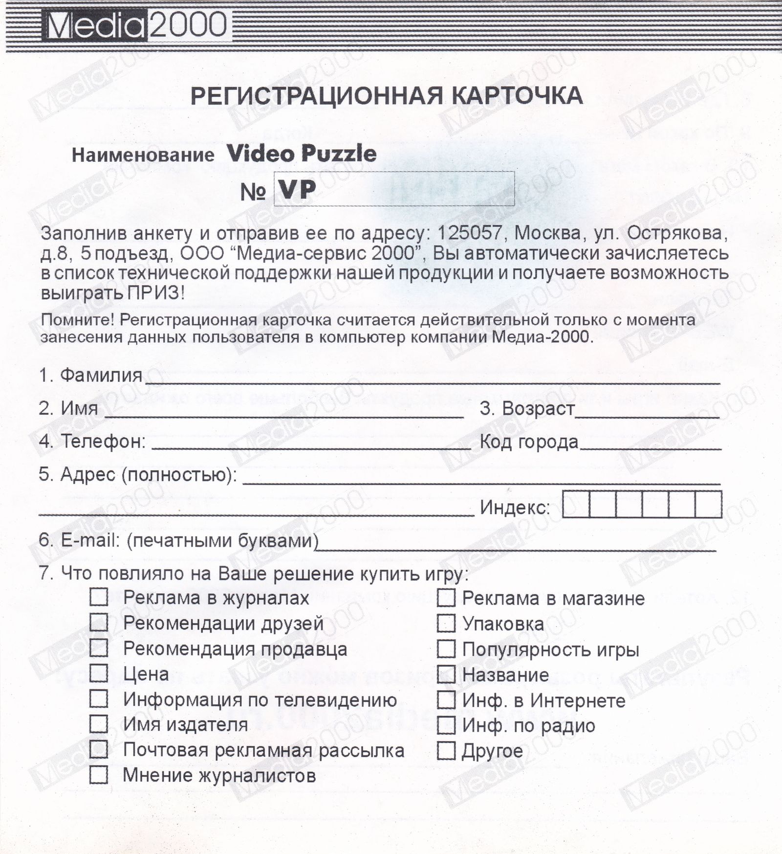 Регистрационная карточка, оборотная сторона