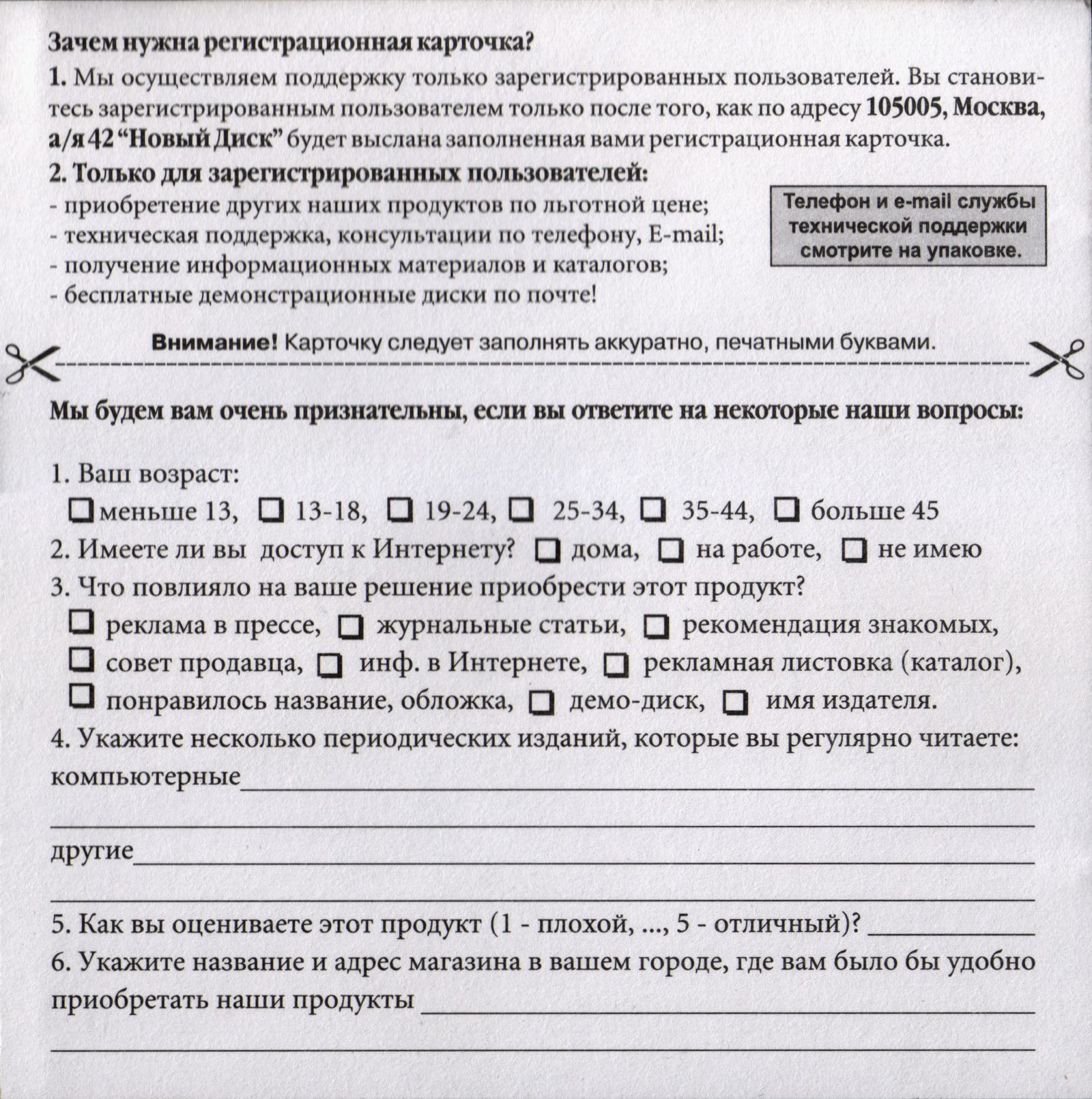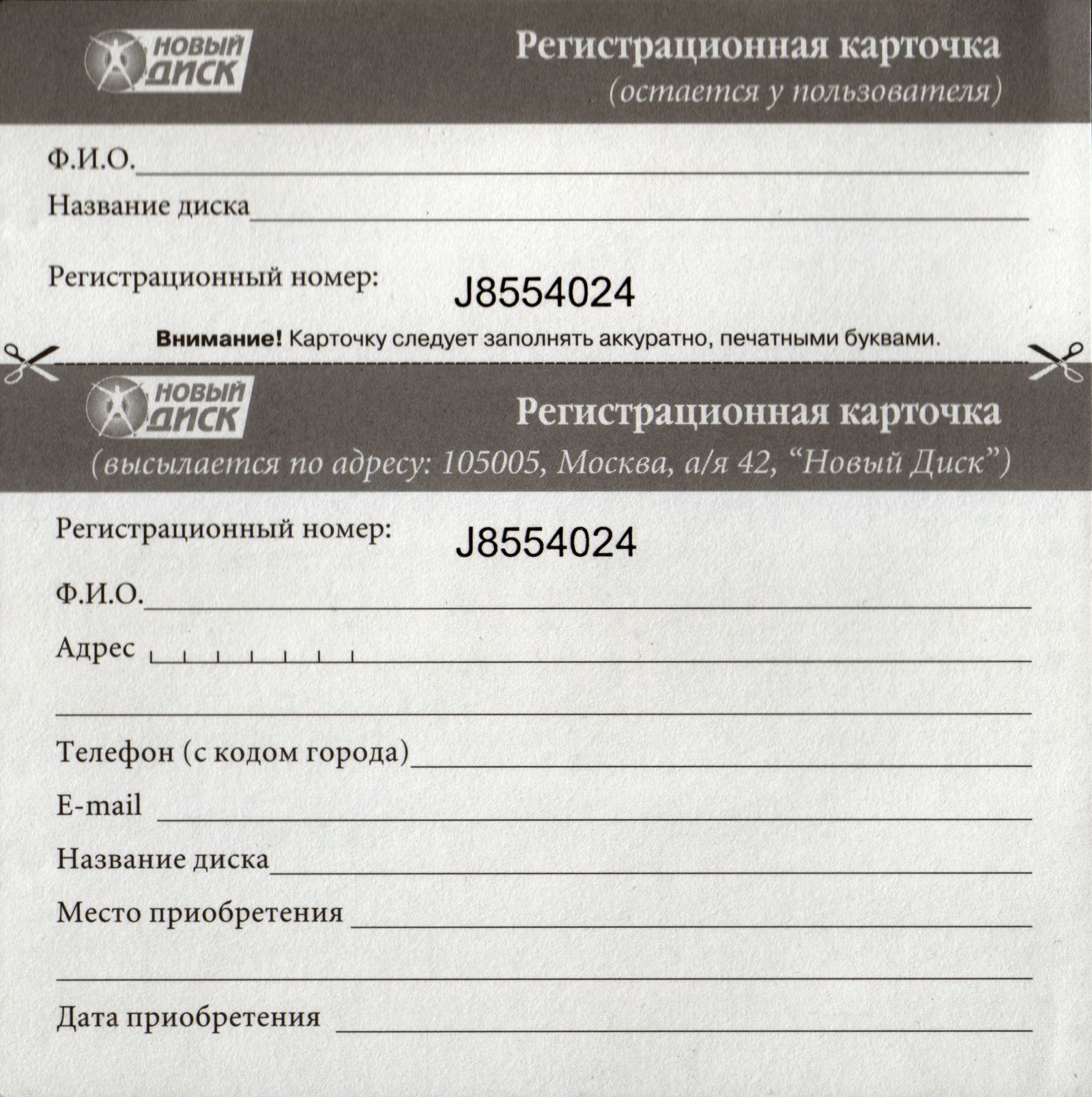 Jewel. Регистрационная карточка, оборотная сторона