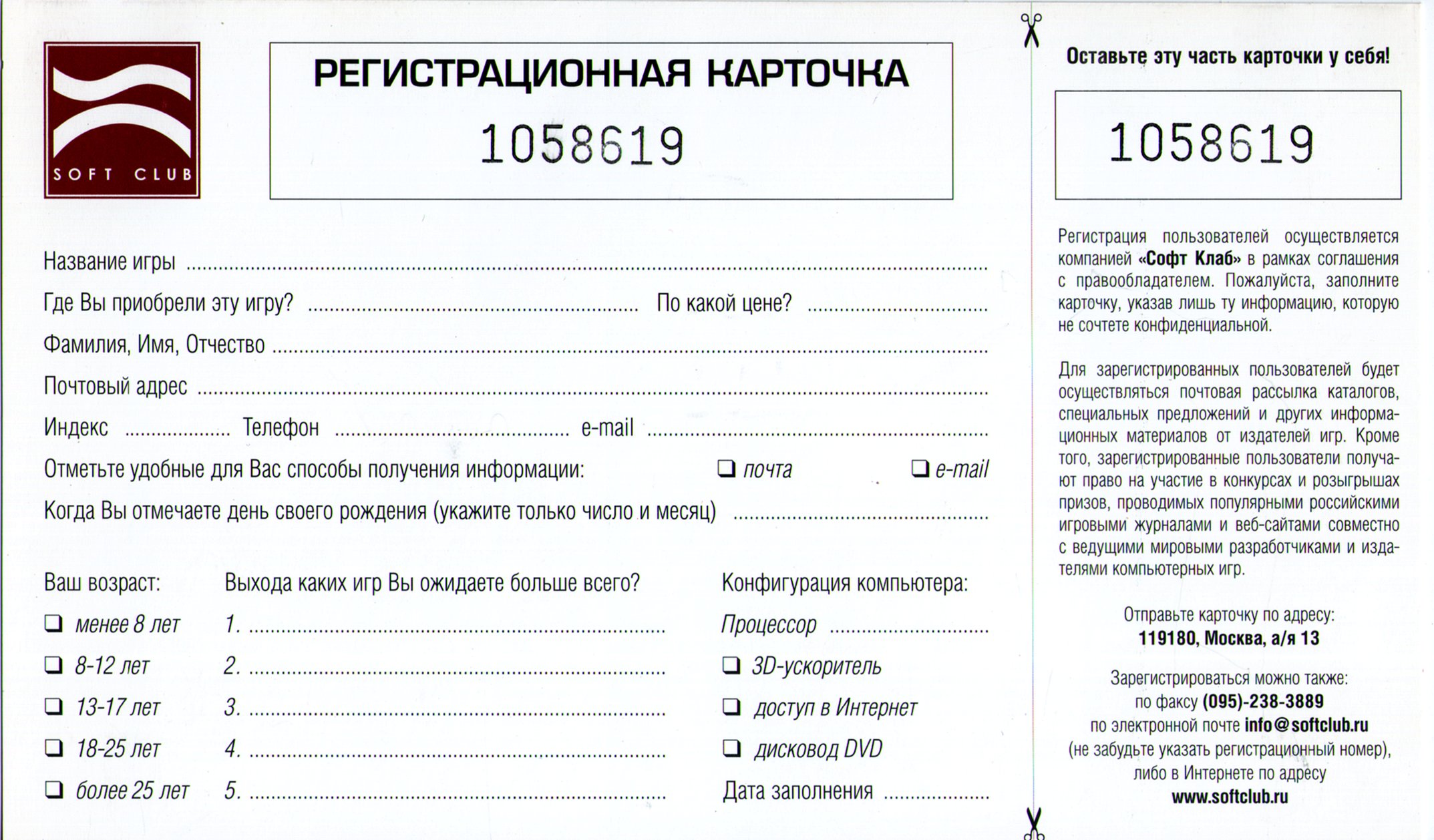 Регистрационная карточка от издания "СофтКлаб"