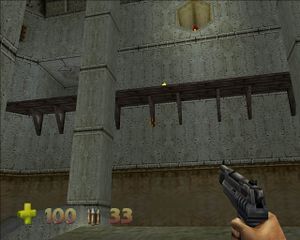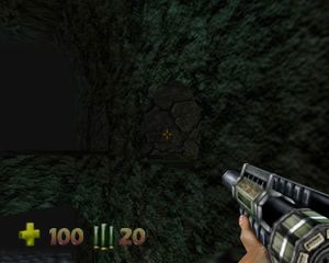 Рисунок я привел не просто так. Если посмотреть на карту, то за колонной, которая справа на рисунке, видно разрыв в контуре. Там находится скрытый проход, который можно расстрелять (3 точных выстрела Шредера обычными патронами или 1 разрывными). Тут открывается проход, который является единственным непонятным для меня местом в игре. Но по порядку: