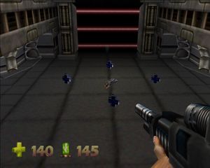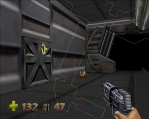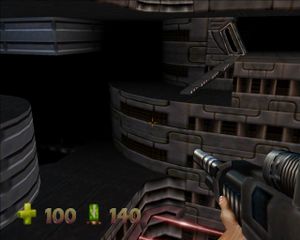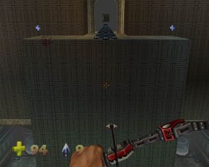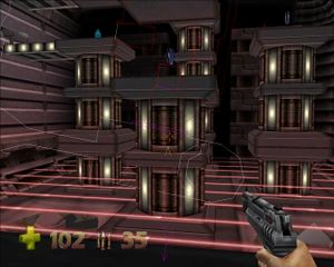 Выходим на площадку со снайперским луком над залом. Прямо внизу - закрытая дверь. Справа площадка с крестами синего здоровья и лестницей, по площадке бродит Trooper. Слева на полу вентилятор поднимает нас на площадку, откуда можно спрыгнуть на дорожку с кнопкой. Кнопка запускает летающую площадку для перехода на противоположное возвышение. Летающая площадка подходит к краю площадки с вентилятором. Она висит там недолго, поэтому нужно, не мешкая спрыгнуть вниз, и по вентилятору забраться наверх, к летающей площадке. Она переносит нас к пульту с кнопкой и Trooper. Кнопка открывает закрытую дверь внизу, из которой вскакивает бот. При нажатии на кнопку сзади появляются два пулемета. Идем в открывшуюся дверь, на входе - пулемет. Дорога расходится налево и направо. Слева - патроны и здоровье. Идем направо, дорога опять раздваивается. Путь прямо ведет к патронам (в коридоре пулемет). Пойдем налево и выйдем в комнату с закрытой дверью и пульту, который охраняет Trooper. На пульте есть кнопка, она открывает стену напротив двери. Там на дне - красные лучи и вентиляторы. Есть колонны с полочками, на одной из них стоит катализатор (рисунок 67):
